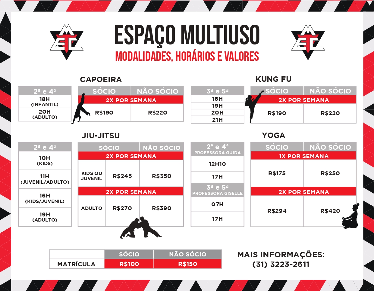 aulas de capoeira, jiu-jitsu, kung fu e yoga.