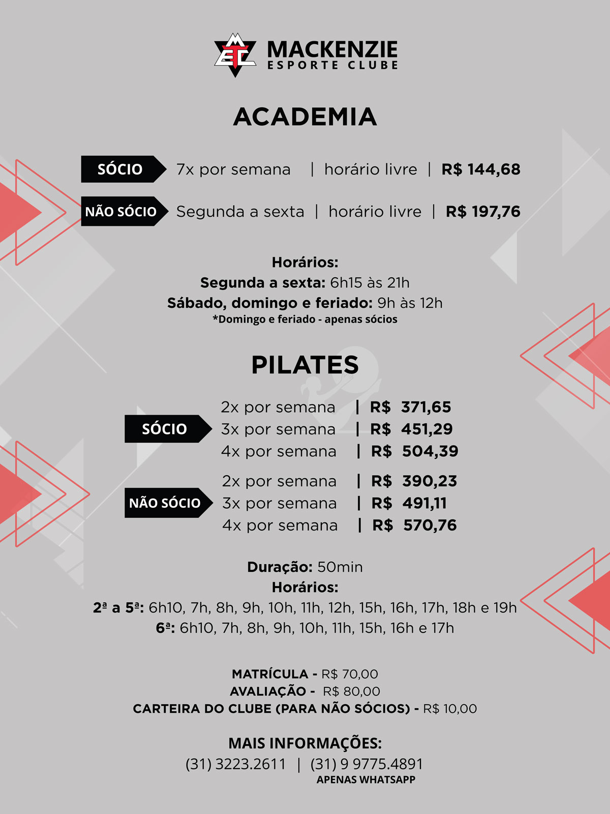 Valores e Horários do Clube 2026