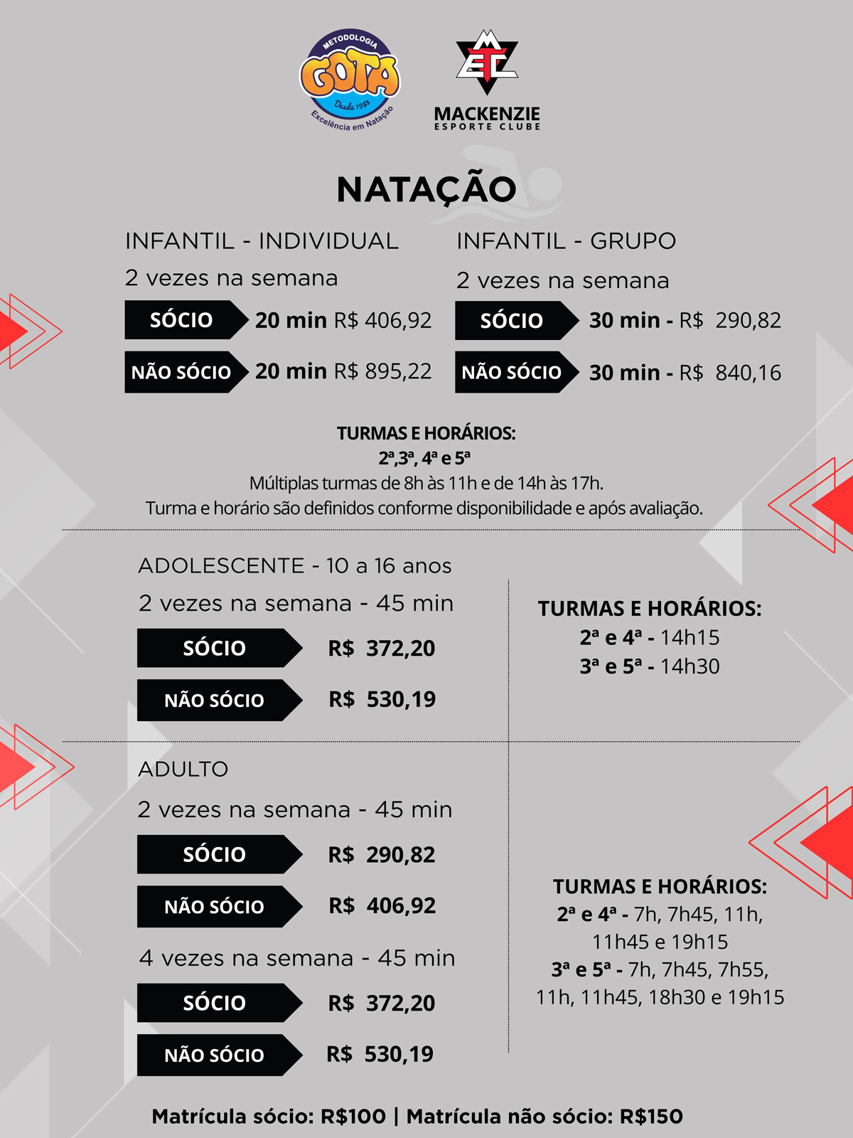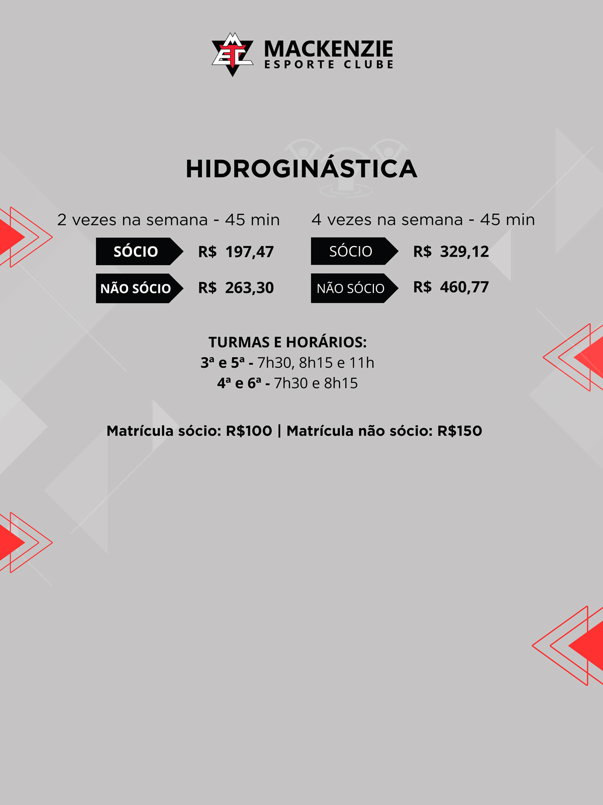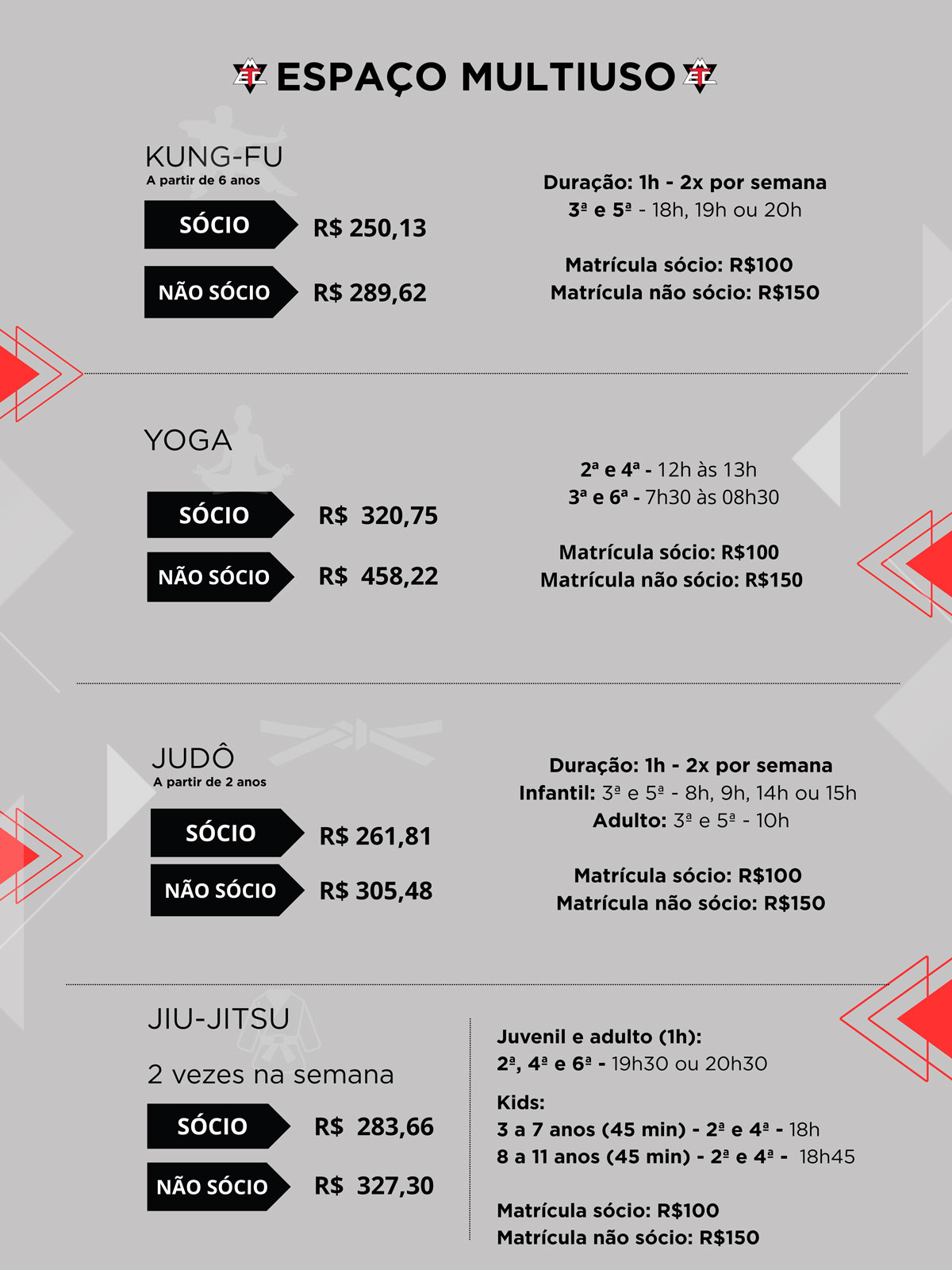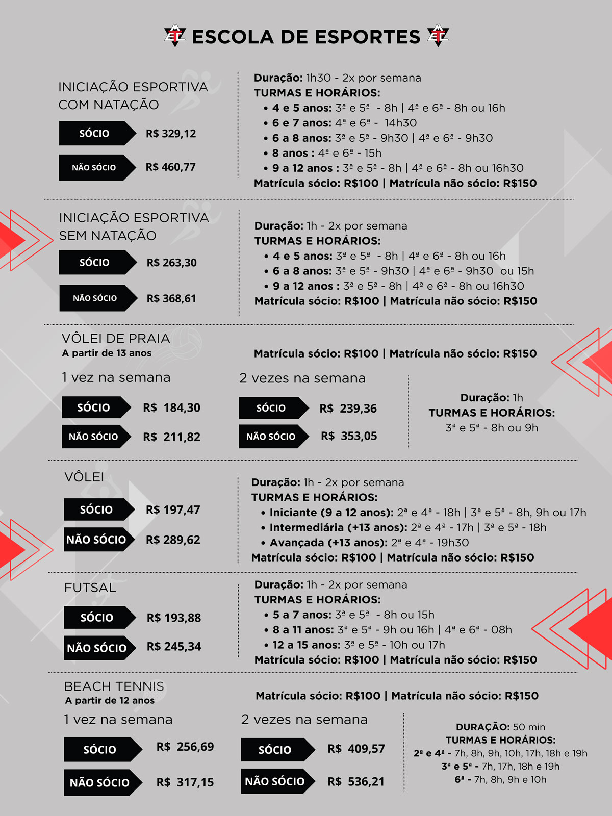 Horários e valores das modalidades esportivas no Clube.